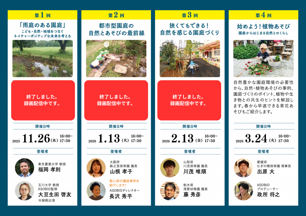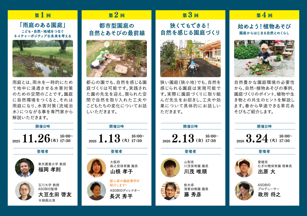 2025年11月、2026年1月、2月、3月の計4回(1回のみの参加も可能です)で、自然豊かな園庭環境に関するセミナー(オンラインzoom形式)を開催します。ゲリラ豪雨等の水害災害対策で注目されている「雨庭」や自然豊かな園庭事例、自然・植物あそびまで、園の先生方や東京農業大学 福岡先生、玉川大学 大豆生田先生、むぎの穂保育園 出原先生をお招きして解説いただきます。お好きな回のみの参加も可能です。お申し込みいただければ、後日録画もご提供します。録画は園内研修で活用いただけます。