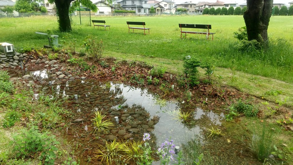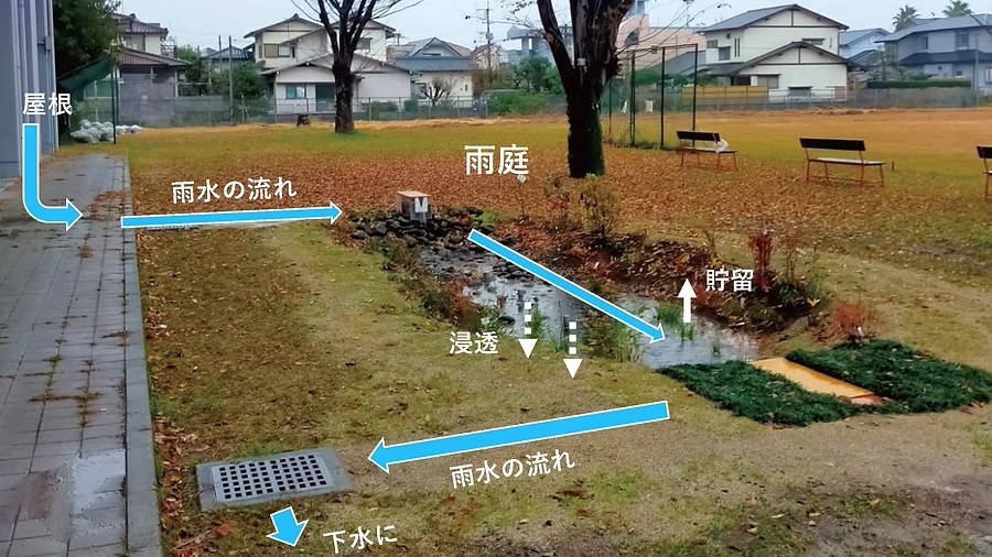 雨庭とは、雨水を一時的にためて地中に浸透させる水害対策のための空間のことです。園庭に自然環境(植栽)をつくるとそこは雨庭になり、水害対策(流域治水)につながります。こども主体の保育を実践するために、園庭に自然環境を取り入れる園が増えています。自然環境を取り入れる事で、あそびが豊になるだけでなく、水害対策にも貢献します。