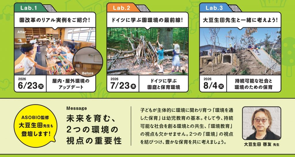 2026年6月、7月、8月の計3回(1回のみの参加も可能です)で、自然豊かな園庭環境や屋内環境に関するセミナー(オンラインzoom形式)を開催します。こども主体の保育環境の実現のために、園庭や保育室を見直した事例の紹介や、ビオトープの発症の国ドイツの保育環境の紹介、持続可能社会の実現のために、環境のための保育の必要性まで、園の先生方や玉川大学 大豆生田先生をお招きし、解説いただきます。お好きな回のみの参加も可能です。お申し込みいただければ、後日録画もご提供します。録画は園内研修で活用いただけます。