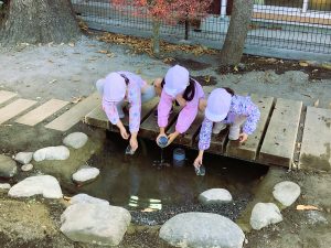 工事が始まると、子どもたちは興味津々。園庭のわずか一角の変化ですが、そこから広がる興味関心の輪は、私たちの想像以上でした。「水の中になにか隠れているよ!」と、図鑑を開いたり、じっと観察したりする姿が見られました。